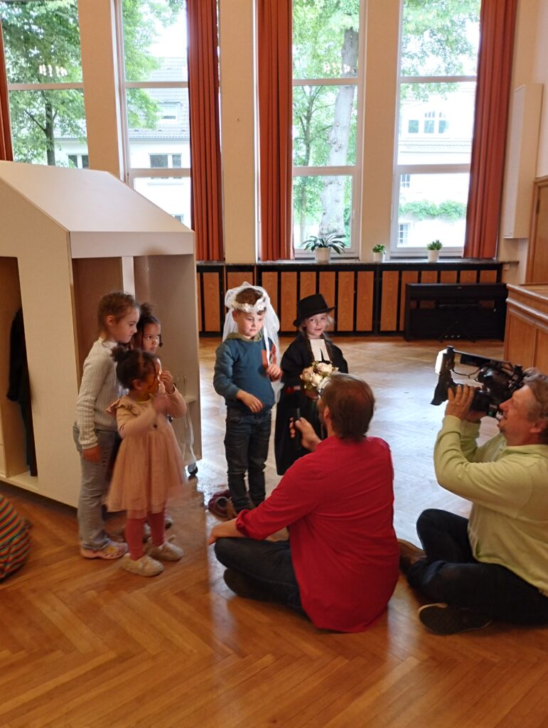 Neben RTL, epd und weiteren Medienvertreter*innen waren eine ganze Menge Kinder aus der Ev. Kita Calvinstraße in Düsseldorf da. Und die hatten viel Freude an und mit der Spielkirche. Es wurde getauft, geheiratet, Abendmahl gefeiert und vieles mehr… Und das selbstverständlich in den Kindertalaren.